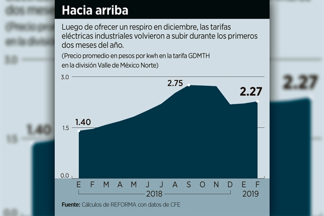 Considerando la tarifa denominada Gran Demanda en Media Tensión Horaria (GDMTH) -usada por empresas manufactureras, maquiladoras, hoteles y hospitales- en la Valle de México Norte, que abarca algunas delegaciones de la Ciudad de México y municipios del Estado de México, la tarifa quedó en un promedio para diferentes horas del día de 2.2727 pesos por kilowatt hora (kwh) para febrero.