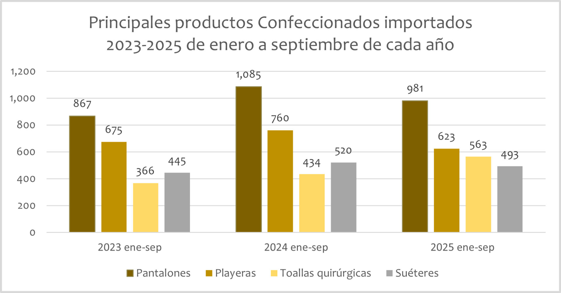Imagen anteriorImagen siguiente Principales productos Confeccionados importados 2023-2025 de enero a septiembre de cada año Principales productos Confeccionados importados 2023-2025 de enero a septiembre de cada año