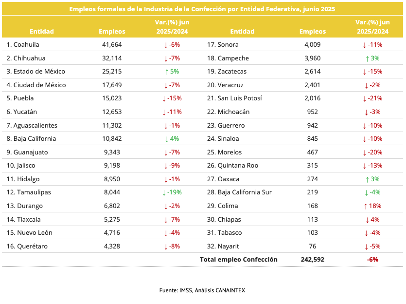 Imagen anteriorImagen siguiente Empleos formales de la Industria de la Confección por Entidad Federativa, junio 2025 Empleos formales de la Industria de la Confección por Entidad Federativa, junio 2025